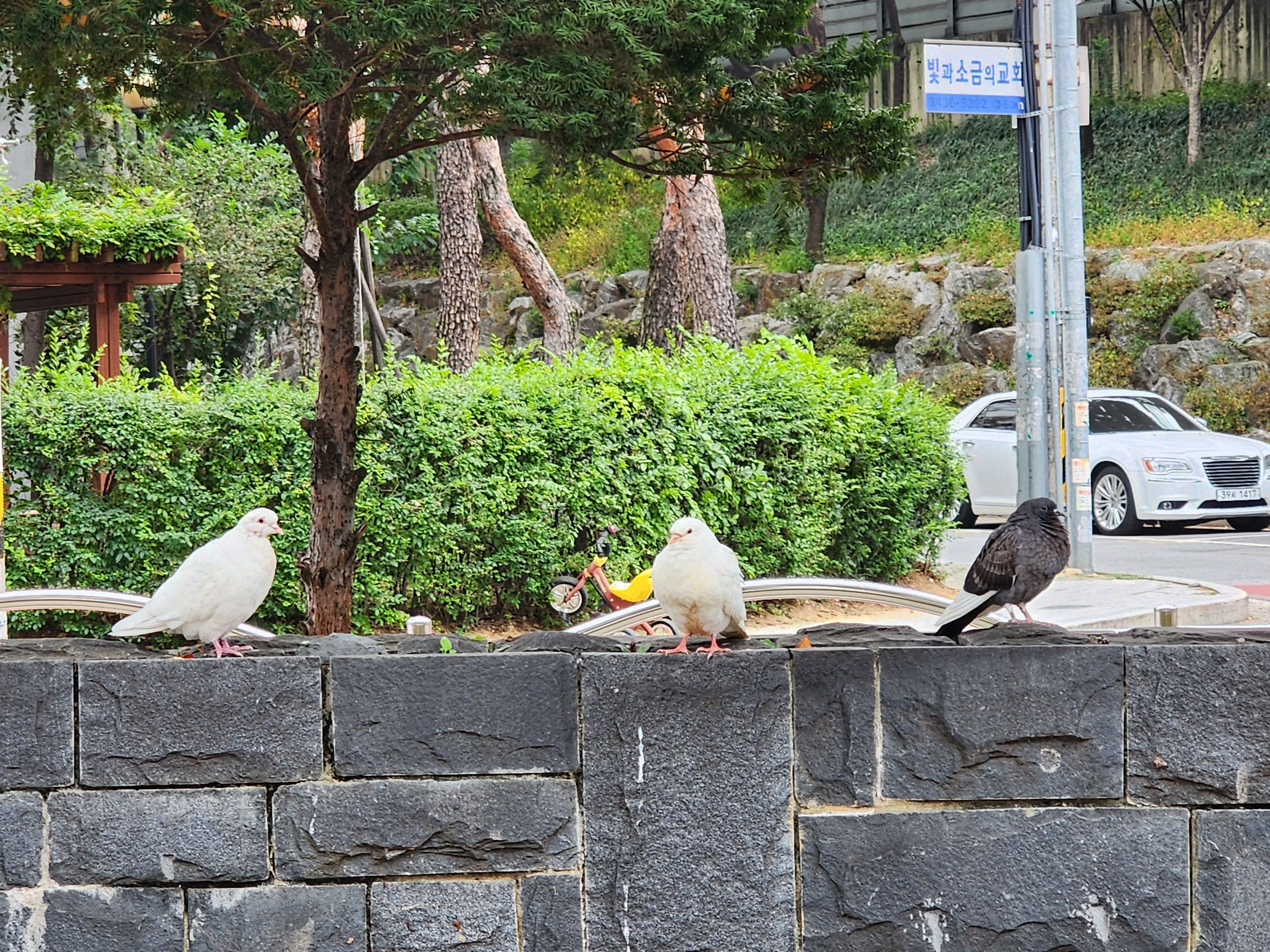 항상 저 담벼락 위에는 고양이 한마리가 앉아 있었는데 주말에는 비둘기 세쌍이 앉아있다