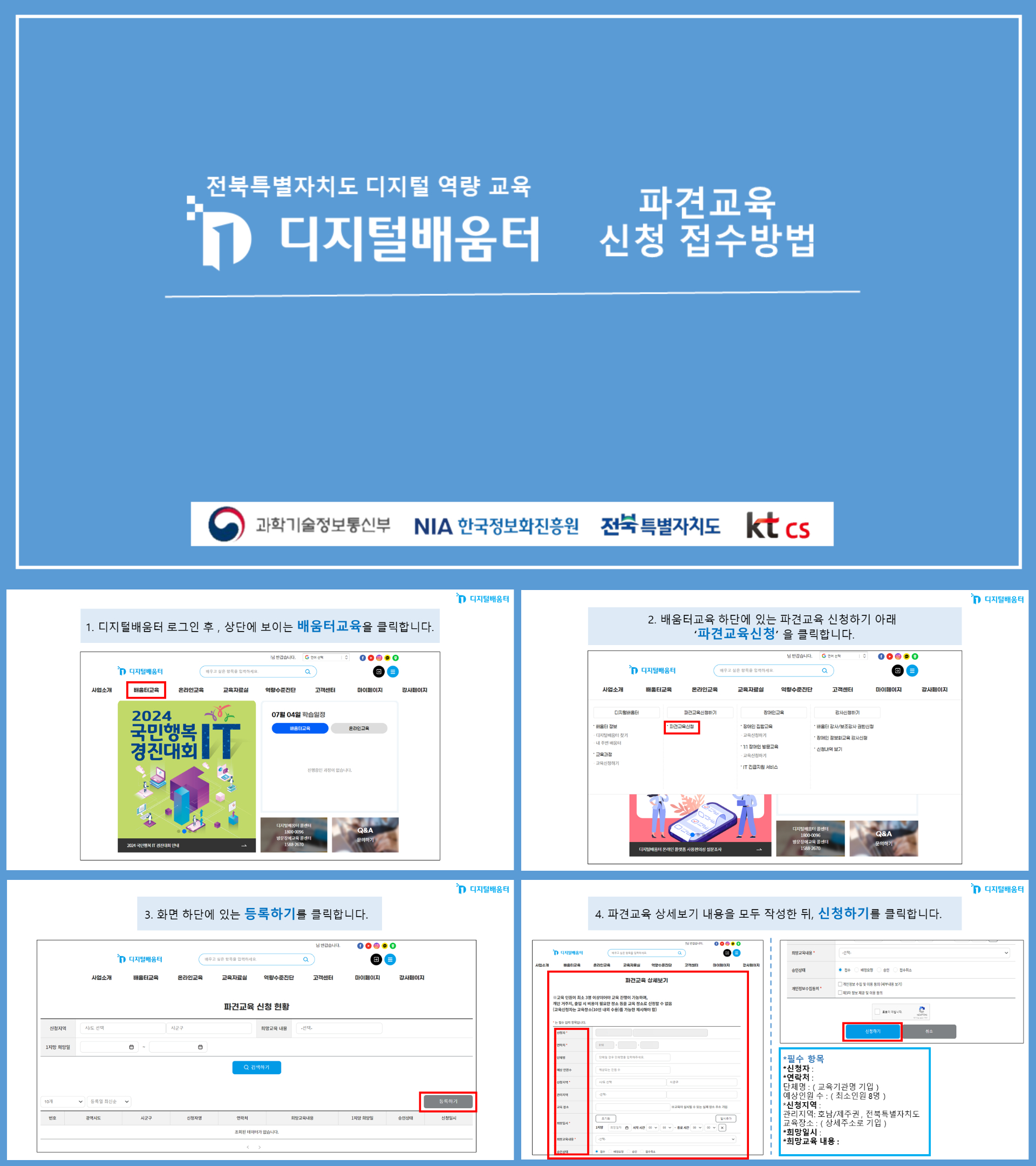 신청방법온라인접수 자격요건 8명이상 교육생이 모인 비영리 기관/단체 - 무료 행사기간2024-07-19 ~ 2024-12-12 접수기간2024-07-19 00시 ~ 2024-12-12 18시 외부링크https://www.xn--2z1bw8k1pjz5ccumkb.kr/main.do# 운영부서정보화정책과프로그램 내용교육생을 모집하여 교육을 신청하면 찾아가는 교육을 진행해요!